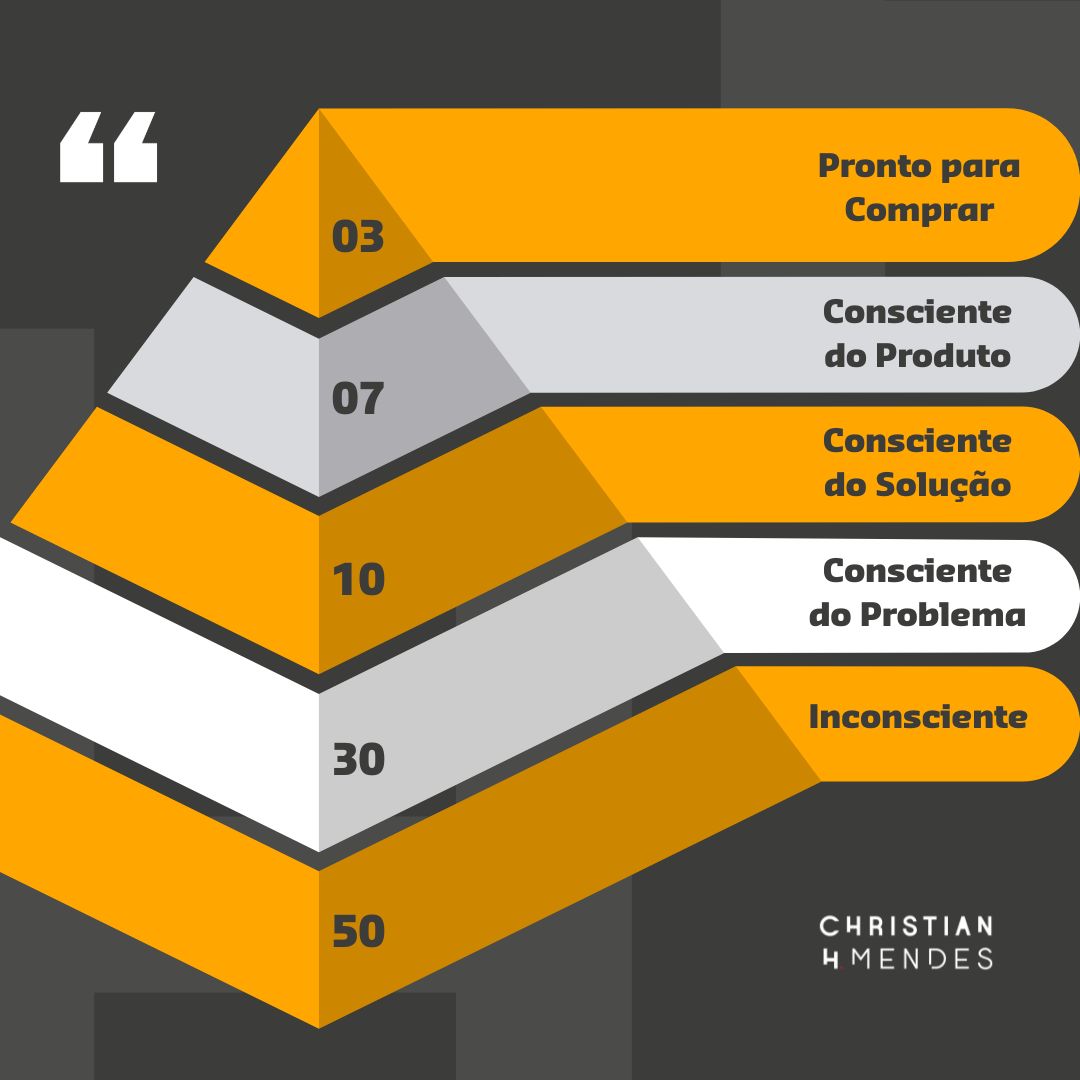 *Importante: eu gosto de usar os percentuais como ferramenta didática ao apresentar a pirâmide de consciência, para ajudar quem nunca viu a enxergar o comportamento do consumidores no funil. Porém, a pirâmide obviamente não vai funcionar exatamente nesses percentuais para todos mercados. Ela foi criada originalmente por Eugene Schwartz no livro Breakthrough Advertising (recentemente lançado no Brasil pela H1 Editora) e quem popularizou a explicação com os percentuais - usando métricas comparativas de mercado - foi Chet Holmes, no livro A Máquina Definitiva de Vendas (link do livro na Amazon).